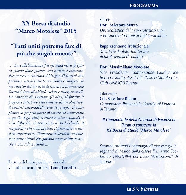 La manifestazione di consegna della XX Borsa di studio “Marco Motolese” avverrà martedì 3 marzo p.v. alle ore 10.30, nell’Aula Magna del Liceo Ginnasio Statale Aristosseno in V.le Virgilio,15 a Taranto e sarà consegnata dal Comandante Provinciale della Guardia di Finanza di Taranto, Col. Salvatore Paiano.