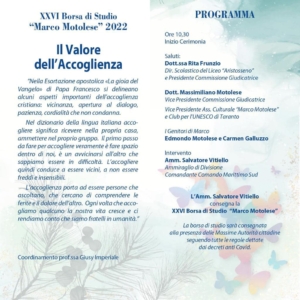 L’evento è stato impreziosito oltre dall’intervento dell’Ammiraglio Vitiello, dalle poesie sul “valore dell’accoglienza”, il tema di questa XXVI edizione della Borsa di studio, declamate da studenti del liceo in lingua francese, spagnola e russa. Tutta l’organizzazione è stata preparata dalla prof Giusy Imperiale. Per la Marina Militare, così come ha sottolineato l’Ammiraglio Di Squadra S. Vitiello, l’accoglienza è un elemento essenziale infatti in ogni momento di necessità nella vita militare ma anche nel quotidiano è sempre stata vicina a tutti anche alla città e ai suoi abitanti. Parole di encomio sono state rivolte dall’Ammiraglio a Carmen Galluzzo e all’intera famiglia. Presentato materiale divulgativo