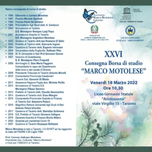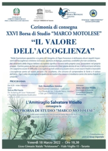 È stato l’Amm. Salvatore Vitiello, Comandante del Comando Marittimo Sud di Taranto, a consegnare la Borsa di Studio a Mihret Cigliola in una cerimonia che si è tenuta nel Liceo Aristosseno alla presenza delle massime autorità cittadine: il Dott. Massimo Gambino, Questore di Taranto, la Dott.ssa Adriana Famà, Viceprefetto aggiunto di Taranto, il Colonnello Massimo Dell’Anna, Comandante Provinciale della Guardia di Finanza, il Colonnello Gaspare Giardelli, Comandante provinciale dei Carabinieri di Taranto, il Colonnello Claudio Castellano, Comandate Scuola Volontari Aeronautica Militare di Taranto, e il Prof. Riccardo Pagano, Direttore del Dipartimento Jonico dell’Università degli Studi di Bari. Oltre, naturalmente alla presenza dei genitori di Marco Edmondo e Carmen Galluzzo del fratello di Marco Massimiliano Motolese con il figlioletto Marco.