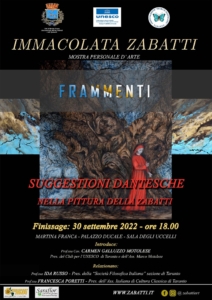 Nella serata del 30 settembre avremo il piacere di salutavi e chiudere la mostra Personale FRAMMENTI invitando tutti gli amici alla serata del 30 settembre, dove si terranno degli interventi sulle opere realizzate dedicate alla Divina Commedia in occasione del settecentesimo anno dalla morte del grande Poeta. Le tre opere rappresentano il I Canto, il V Canto e l’ultimo Canto dell’Inferno. Le relazioni saranno tenute dalla Prof.ssa Ida Russo, Presidente della “Società Filosofica Italiana” di Taranto, e dalla Prof.ssa Francesca Poretti, Presidente dell’Associazione Italiana di Cultura Classica – delegazione di Taranto “Adolfo Mele”. Presentato materiale divulgativo