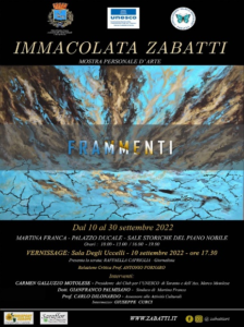 “Frammenti” è il titolo della mostra personale dell’artista Immacolata Zabatti che sarà inaugurata a Martina Franca, nella Sala degli Uccelli di Palazzo Ducale, il prossimo 10 settembre, alle ore 17.30. L’esposizione sarà allestita nelle sale storiche del piano nobile di Palazzo Ducale dal 10 al 30 settembre, visitabile negli orari 10-13 e 16-19. Cav. Prof. Carmen Galluzzo Motolese, presidente dell’Associazione Marco Motolese e del Club per l’UNESCO di Taranto presenta la mostra personale della pittrice Immacolata Zabatti, con il patrocinio del Comune di Martina Franca. “Nel 1997, a Parigi – dichiara la presidente Galluzzo – presso la direzione generale dell’Unesco, fu sancito lo Statuto dell’Artista, il cui obiettivo era quello di valorizzare sempre di più il ruolo dell’artista per uno sviluppo culturale della società. Per rilanciare il significato dello stesso, noi del Club per l’Unesco di Taranto presentiamo Immacolata Zabatti con le sue opere di pregio, tre delle quali dedicate a Dante realizzate nel 2021, in occasione del settecentesimo anno dalla morte del grande poeta. Gli Articoli 1 e 2 dello statuto – ricorda Galluzzo – così recitano: noi artisti, autori, riuniti dal 16 al 20 giugno 1997, dall’Unesco, (…) nell’ambito del Congresso mondiale (…), riaffermiamo, che la creazione artistica costituisce il patrimonio culturale del futuro. (…) Ricordiamo con forza che la facoltà di creare è una capacità particolare, la cui potenza e originalità provengono dall’artista, e che è importante incoraggiare la rivelazione e lo sviluppo del talento di ognuno, come manifestazione di una libertà fondamentale”.