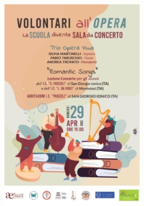Si è concluso un progetto che ha incontrato tantissimi giovani in ben 5 scuole di Taranto e Provincia. L’Auditorium dell’I.C. “Pascoli” San Giorgio Ionico (Ta) ha accolto gli alunni del medesimo Istituto, di cui la Prof.ssa Caterina Bagnardi è Dirigente Scolastico, e gli alunni dell’I. C. “L. Da Vinci” di Monteiasi-Montemesola per l’ascolto di un concerto inserito nel progetto “Volontari all’Opera – La scuola diventa Sala da Concerto”, promosso dalla rete composta dalle ODV Ragazzi in Gamba Taranto, Associazione Culturale “Marco Motolese” Taranto, Associazione OdV ArmoniE, Gruppo Anonimo ‘74 Monteiasi, dal Club per l’Unesco di Taranto e sostenuta dal Csv Taranto (Centro Servizi Volontariato) nell’ambito dell’azione “Idee di rete per promuovere il volontariato 2020/2021”.
