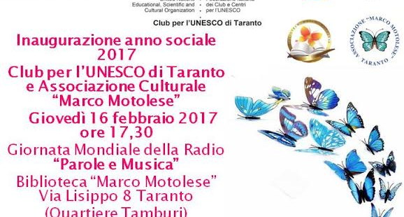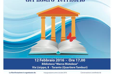 Sarà inaugurato venerdì 12 febbraio alle ore 17:00  l’anno sociale 2016 dell’Associazione Marco Motolese e del Club per l’UNESCO di Taranto con una conversazione su Musei – Archivi – Biblioteche, per una ...