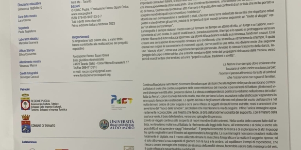 19 Febbraio 2023 I Giardini della Preesistenza. Un viaggio fotografico nell’universo misicale di Battiato. Inaugurazione della mostra al Crac Puglia. Il catalogo curato da Lara Caccia critico d’arte e docente universitaria. Un ...