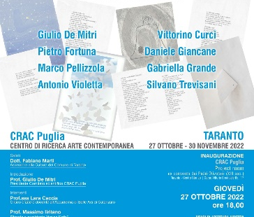 27 ottobre 2022 Giovedì 27 ottobre p.v. alle ore 18.00 al CRAC Puglia (Centro di Ricerca Arte Contemporanea) della Fondazione Rocco Spani Onlus avrà luogo, nel nuovo spazio Project room, l’inaugurazione della mostra tra parola ...